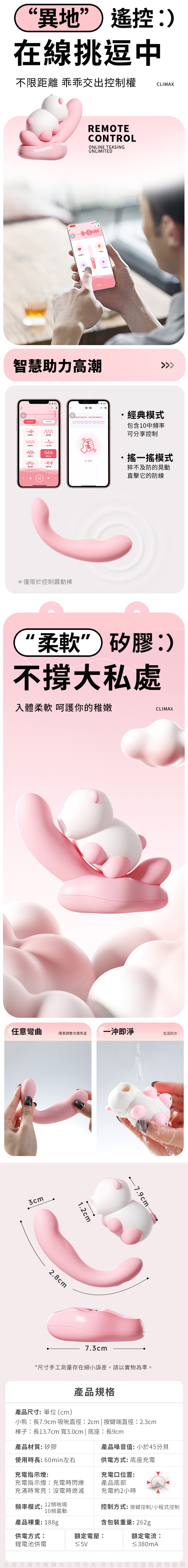 趴趴熊採用吸吮+震動雙重模式,搭載 10 頻震動變化,節奏細膩且層次豐富。整體以親膚矽膠製成,觸感柔軟安心;低於 45 分貝 的靜音表現,使用過程更自在。支援按鍵控制與小程式控制,操作靈活,滿足不同使用習慣。